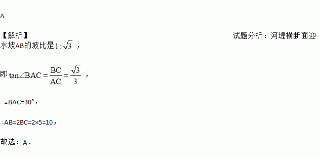 如图所示,河堤横断面迎水坡AB的坡比是1: ,堤高BC=5m,则坡面AB的长度是( )