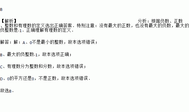 B 【解析】分析:根据负数、正数、整数和有理数的定义选出正确答案.特别注意:没有最大的正数,也没有最大的负数,最大的负整数是-1.正确理解有理数的定义. 解答:【解析】 A、0不是最小的整数,故本选项错误; B、最大的负整数-1,故本选项正确; C、有理数分为整数和分数,故本选项错误; D、0的平方还是0,不是正数,故本选项错误. 故选B.