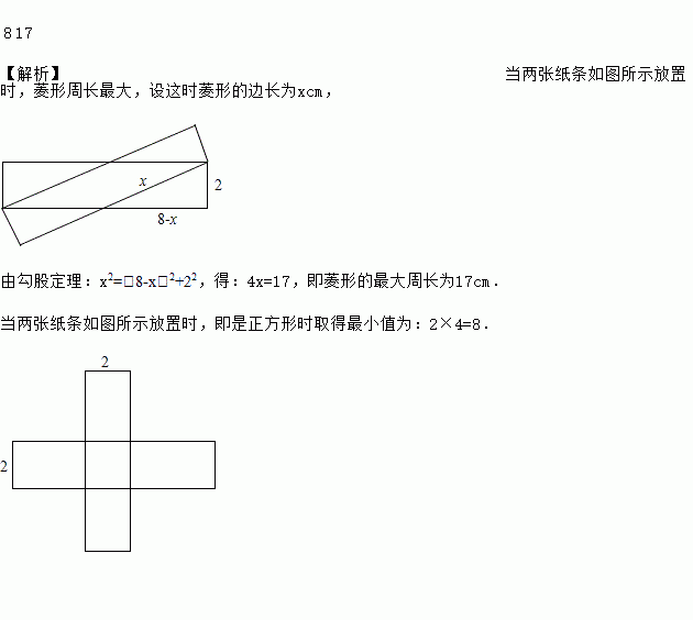 如图,将两张长为8,宽为2的矩形纸条交叉,使重叠部分ABCD是一个菱形。菱形周长的最小值是_________,菱形周长最大值是_________.