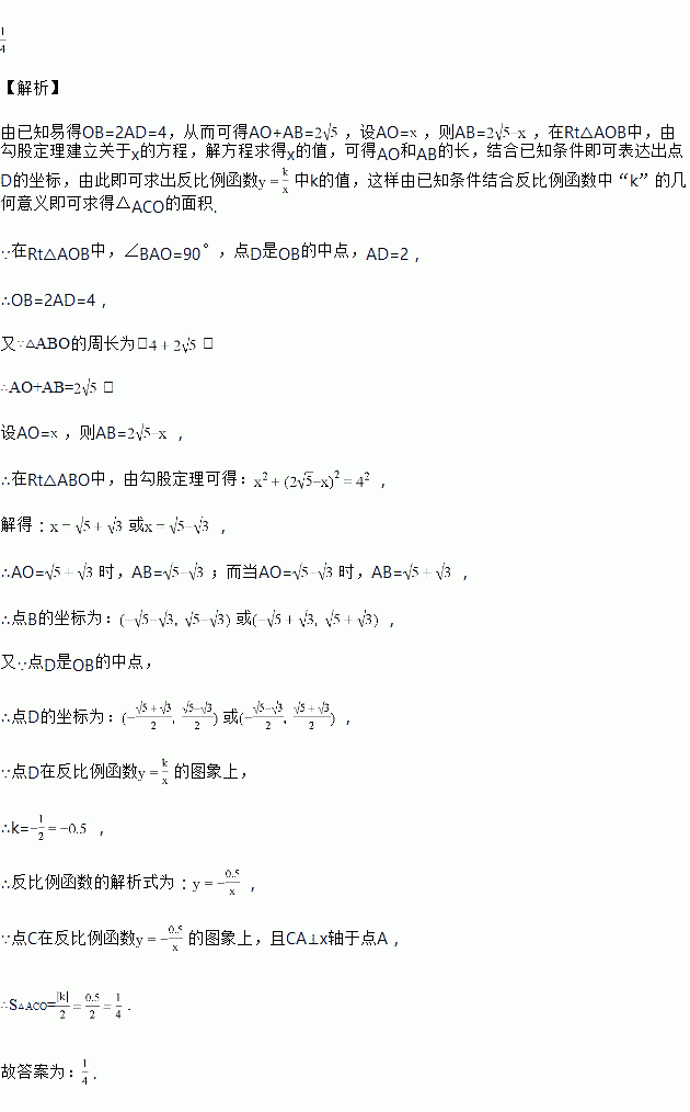 如图,已知反比例函数的图象过Rt△ABO斜边OB的中点D,与直角边AB相交于点C,连接AD,OC.若△ABO的周长为,AD=2,则△ACO的面积为_________.