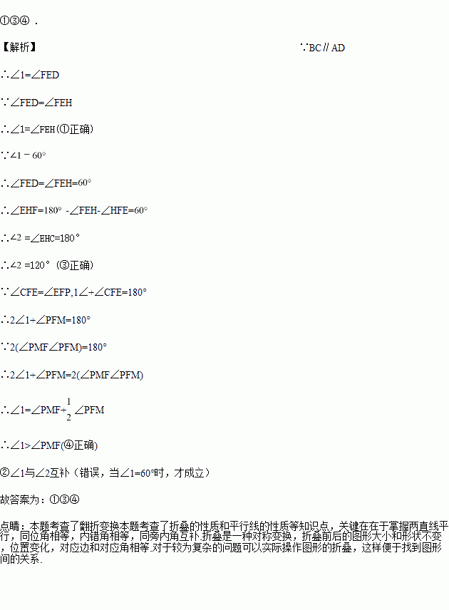 如图,将长方形纸片ABCD沿EF折叠后,点C、D分别落在P、Q的位置,EQ的延长线交BC边于H.下列说法正确的有_____.(只填序号)