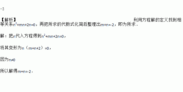 若n(其中n≠0)是关于x的方程x2+mx+2n=0的根,则m+n的值为_______ .