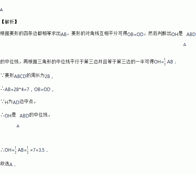 如图,菱形ABCD中,对角线AC、BD相交于点O,H为AD边中点,菱形ABCD的周长为28,则OH的长等于( )