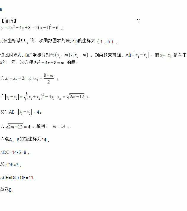 小明以二次函数y=2x2-4x+8的图象为灵感为“2017北京·房山国际葡萄酒大赛”设计了一款杯子,如图为杯子的设计稿,若AB=4,DE=3,则杯子的高CE为( )