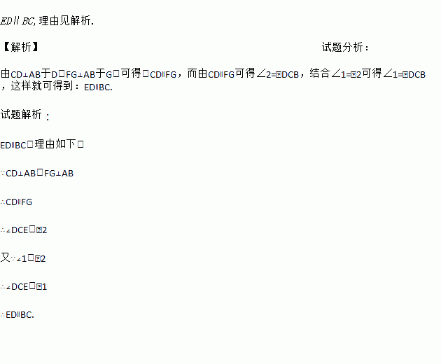 如图,在三角形ABC中,CD⊥AB于D,FG⊥AB于G, ∠1=∠2,试问ED∥BC吗?说说你的理由.