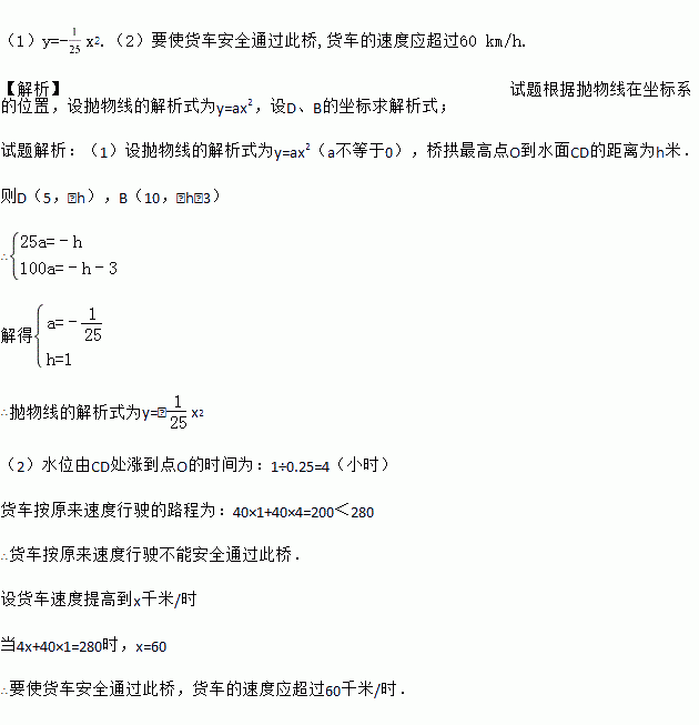 (2)现在一辆载有救援物资的货车从甲地出发需经过此桥开往乙地,已知甲地距此桥280 km(桥长忽略不计).货车正以40 km/h的速度开往乙地,当行驶了1 h后,突然接到紧急通知:前方连降暴雨,造成水位以0.25 m/h的速度持续上涨(货车接到通知时,水位在CD处,当水位涨到拱桥最高点O时,禁止车辆通行).