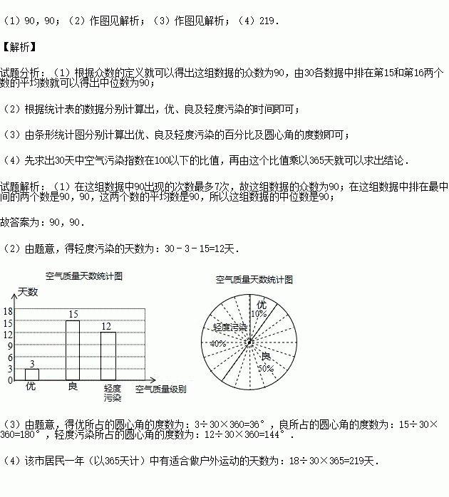 (1)直接写出空气污染指数这组数据的众数 ,中位数 ;