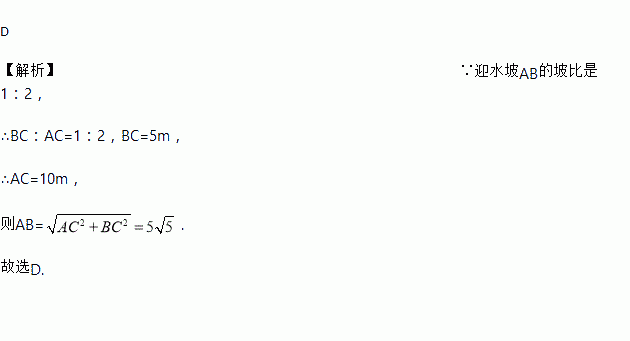 如图所示,河堤横断面迎水坡AB的坡比是1:2,坡高BC=5m,则坡面AB的长度( )