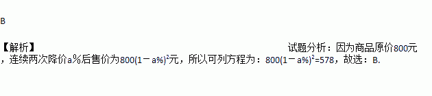 A. 800(1+a%)2=578 B. 800(1-a%)2="578" C. 800(1-2a%)=578 D. 800(1-a2%)=578