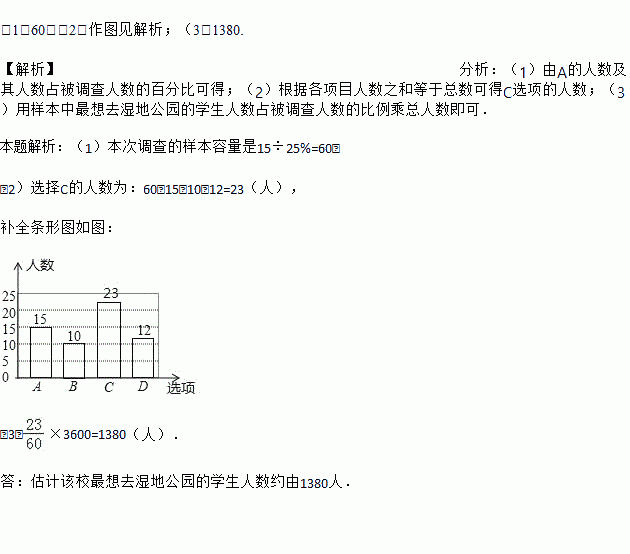 (3)若该学校共有3 600名学生,试估计该校去湿地公园的学生人数.