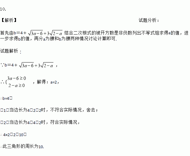 已知a,b分别为等腰三角形的两条边长,且a,b满足b=4+,求此三角形的周长.
