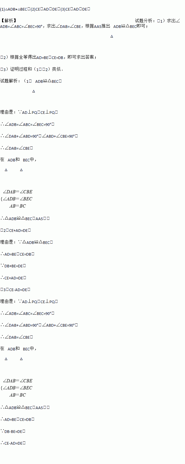 (1)△ADB≌△BEC,(2)CE+AD=DE,(3)CE-AD=DE, 【解析】试题分析:(1)求出∠ADB=∠ABC=∠BEC=90°,求出∠DAB=∠CBE,根据AAS推出△ADB≌△BEC即可; (2)根据全等得出AD=BE,CE=DB,即可求出答案; (3)证明过程和(1)(2)类似. 试题解析:(1)△ADB≌△BEC, 理由是:∵AD⊥PQ,CE⊥PQ...
