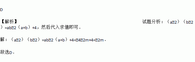 D 【解析】试题分析:(a﹣2)(b﹣2)=ab﹣2(a+b)+4,然后代入求值即可. 【解析】 (a﹣2)(b﹣2)=ab﹣2(a+b)+4=﹣4﹣2m+4=﹣2m. 故选D.
