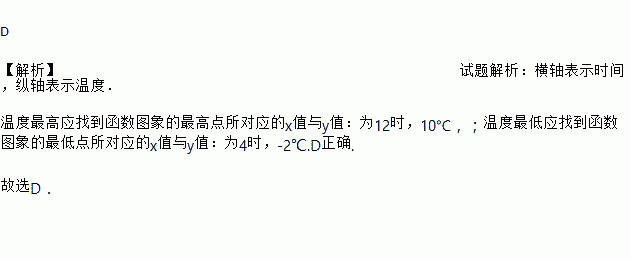 D 【解析】试题解析:横轴表示时间,纵轴表示温度. 温度最高应找到函数图象的最高点所对应的x值与y值:为12时,10℃,;温度最低应找到函数图象的最低点所对应的x值与y值:为4时,-2℃.D正确. 故选D.