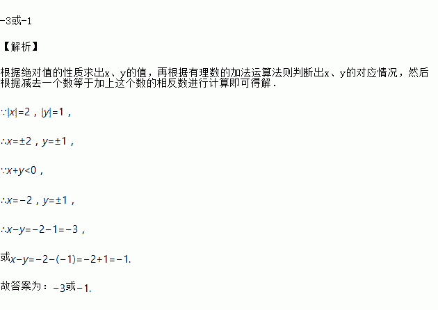 已知|x|=2,|y|=1,且x+y<0,则x﹣y的值是_____.