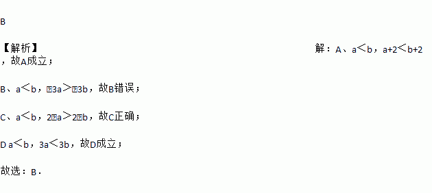 A. a+2<b+2 B. ﹣3a<﹣3b C. 2﹣a>2﹣b D. 3a<3b