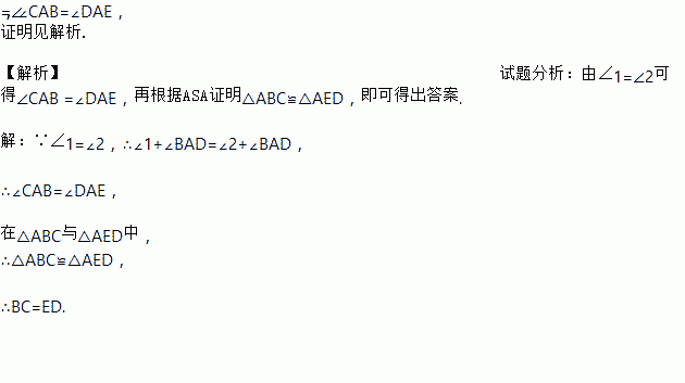 已知:如图,AB=AE,∠1=∠2,∠B=∠E.求证:BC=ED.