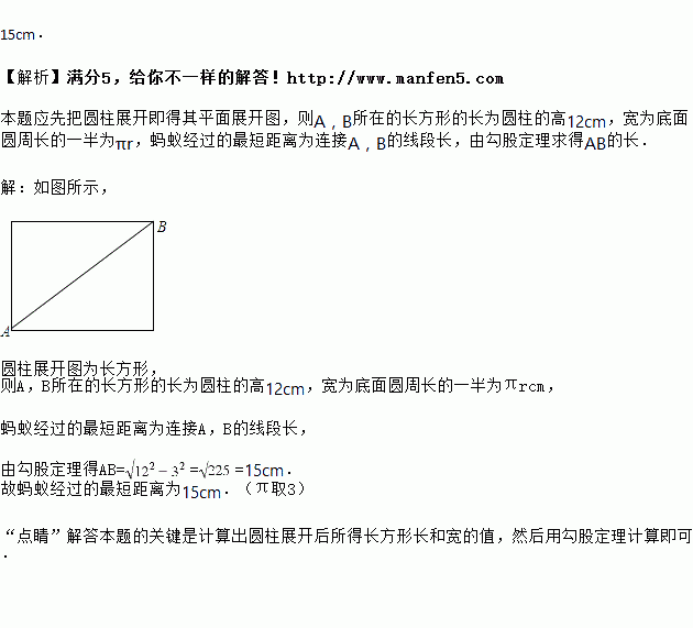 如图,有一圆柱,其高为12cm,它的底面半径为3cm,在圆柱下底面A处有一只蚂蚁,它想得到上面B处的食物,则蚂蚁经过的最短路程为________ cm.(π取3)