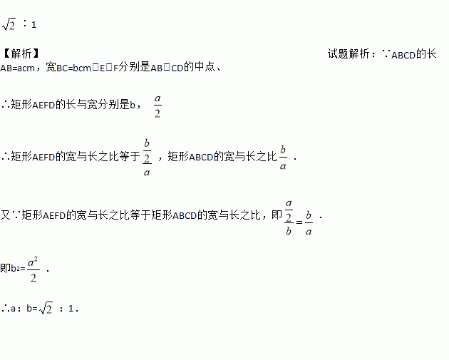 如图,一张矩形报纸ABCD的长AB=acm,宽BC=bcm,E、F分别是AB,CD的中点.将这张报纸沿着直线EF对折后,矩形AEFD的长与宽之比等于矩形ABCD的长与宽之比.则a∶b等于________.