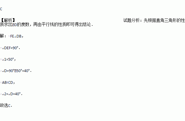 如图所示,AB∥CD,EF⊥BD,垂足为E,∠1=50°,则∠2的度数为( )