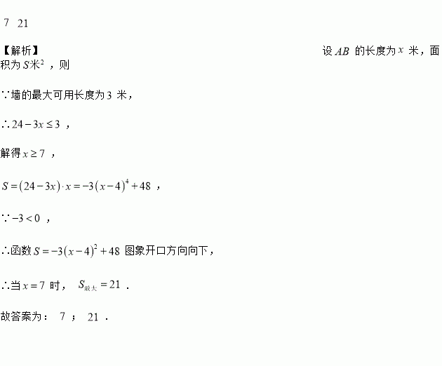 如图,有长为米的篱笆,一边利用墙(墙的最大可用长度为米),围成一个由两个长方形组成的花圃,当花圃的边为__________米时,围成的花圃面积最大,最大面积为__________平方米.