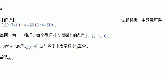 如图,圆的周长为4个单位.在该圆的4等分点处分别标上0、1、2、3,先让圆周上表示数字0的点与数轴上表示-1的点重合,再将数轴按逆时针方向环绕在该圆上.则数轴上表示-2017的点与圆周上重合点的数字是( ) .