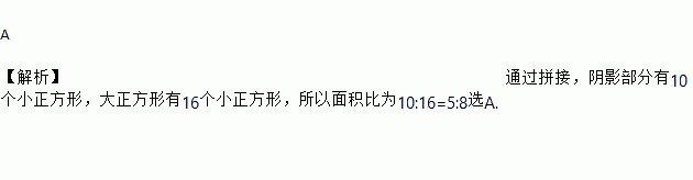A 【解析】通过拼接,阴影部分有10个小正方形,大正方形有16个小正方形,所以面积比为10:16=5:8选A.
