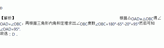 D 【解析】根据△OAD≌△OBC得∠OAD=∠OBC,再根据三角形内角和定理求出∠OBC度数∠OBC=180°-65°-20°=95°然后可知∠OAD=95°. 故选:D.
