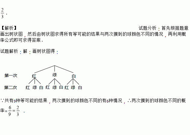 在一个不透明的口袋中有1个红球,1个绿球和1个白球,这3个球除颜色不同外,其他都相同.从口袋中随机摸出1个球,记录其颜色,然后放回口袋并摇匀;再从口袋中随机摸出1个球,记录其颜色.请用画树状图(或列表)的方法,求两次摸到的球颜色不同的概率.