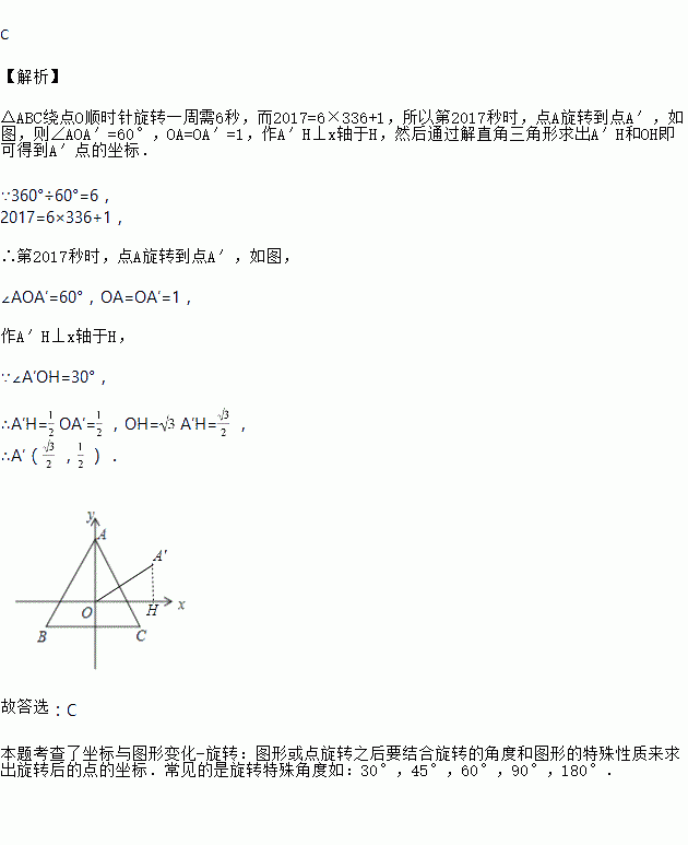 如图所示,平面直角坐标的原点是等边三角形的中心,A(0,1),把△ABC绕点O顺时针旋转,每秒旋转60°,则第2017秒时,点A的坐标为( )