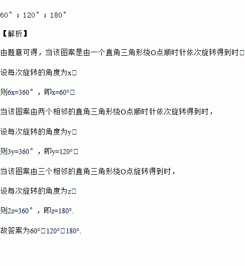 如图所示的图案是由六个全等的直角三角形组成,点O是该图案的中心,则该图案可看成由一个直角三角形绕O点顺时针依次旋转________得到,或可看成由两个相邻的直角三角形绕O点顺时针依次旋转________得到,或可看成由三个相邻的直角三角形绕O点旋转________得到.