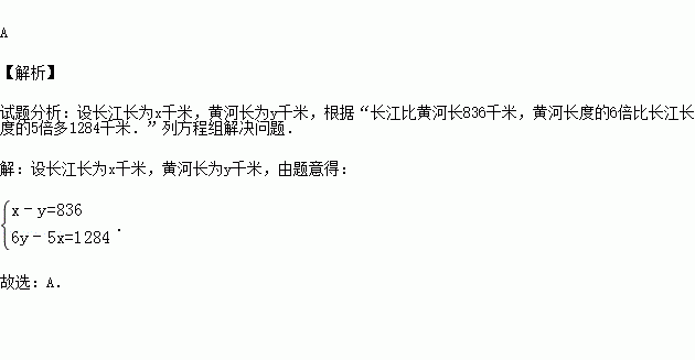 地理老师介绍到:长江比黄河长836千米,黄河长度的6倍比长江长度的5倍多1284千米.小东根据地理教师的介绍,设长江长为x千米,黄河长为y千米,然后通过列、解二元一次方程组,正确地求出了长江和黄河的长度,那么小东列的方程组可能是( )