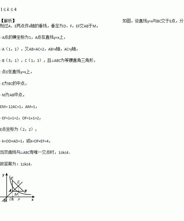 如图,Rt△ABC在第一象限, ,AB=AC=2,点A在直线上,其中点A的横坐标为1,且AB∥轴,AC∥轴,若双曲线与有交点,则k的取值范围是_______.