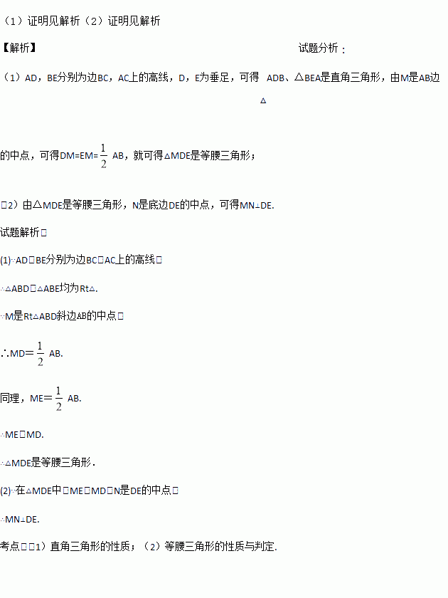 如图,在△ABC中,AD,BE分别为边BC,AC上的高线,D,E为垂足,M为AB的中点,N为DE的中点.求证: