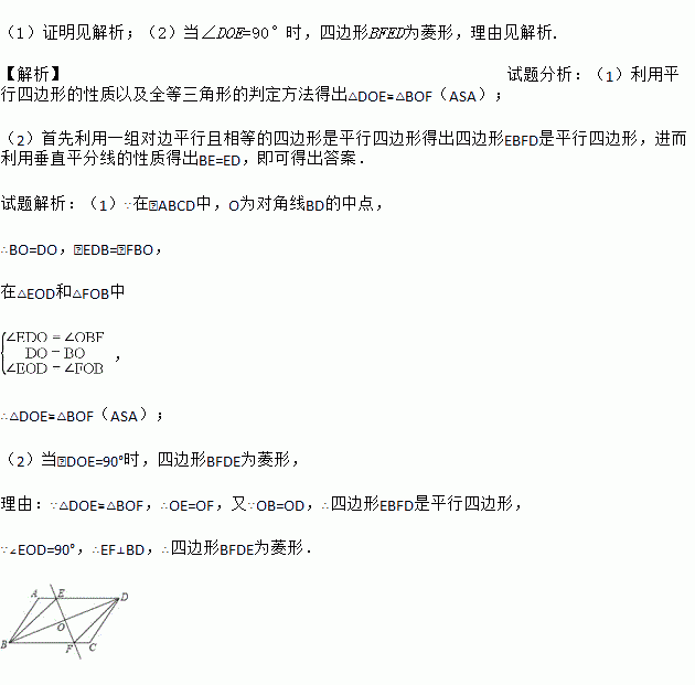 (2)当∠DOE等于多少度时,四边形BFDE为菱形?请说明理由.