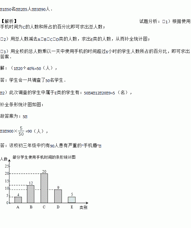 (3)若一天中手机使用时间超过6h,则患有严重的“手机瘾”,该校初三学生共有900人,请估计该校初三年级中患有严重的“手机瘾”的人数.