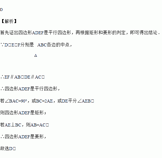 如图,D、E、F分别是△ABC各边的中点.添加下列条件后,不能得到四边形ADEF是矩形的是( )