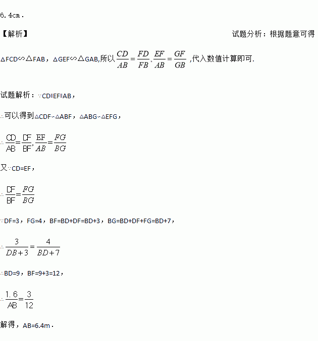 如图,有一路灯杆AB(底部B不能直接到达),在灯光下,小明在点D处测得自己的影长DF=3m,沿BD方向到达点F处再测得自己得影长FG=4m,如果小明得身高为1.6m,求路灯杆AB的高度。