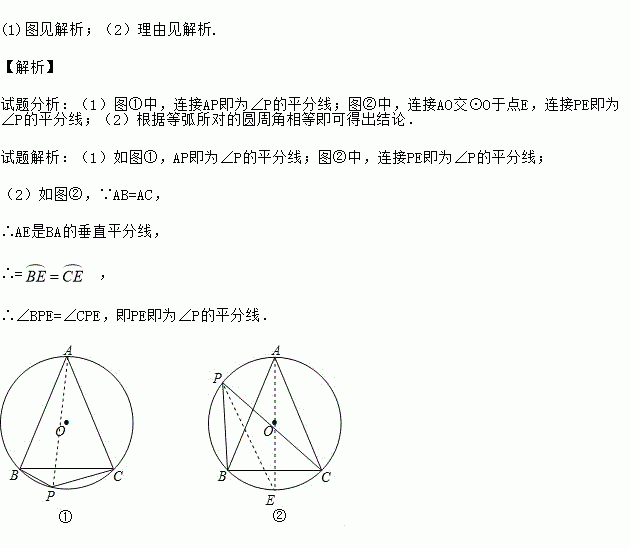 (1)图见解析;(2)理由见解析. 【解析】 试题分析:(1)图①中,连接AP即为∠P的平分线;图②中,连接AO交⊙O于点E,连接PE即为∠P的平分线;(2)根据等弧所对的圆周角相等即可得出结论. 试题解析:(1)如图①,AP即为∠P的平分线;图②中,连接PE即为∠P的平分线; (2)如图②,∵AB=AC, ∴AE是BA的垂直平分线, ∴= , ∴∠BPE...