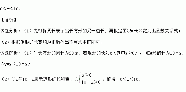 0<x<10. 【解析】 试题分析:(1)先根据周长表示出长方形的另一边长,再根据面积=长×宽列出函数关系式; (2)根据矩形的长宽均为正数列出不等式求解即可. 试题解析:(1)∵长方形的周长为20cm,若矩形的长为x(其中x>0),则矩形的长为10﹣x, ∴y=x(10﹣x) (2)∵x与10﹣x表示矩形的长和宽,∴,解得:0<x<10.