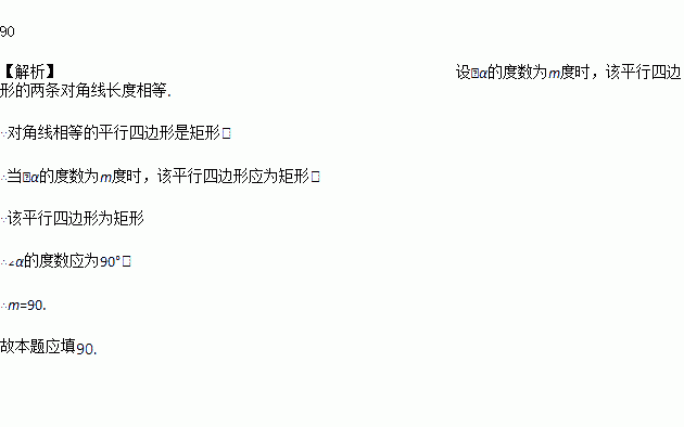 如图是一个平行四边形,当∠α的度数为________度时,两条对角线长度相等.