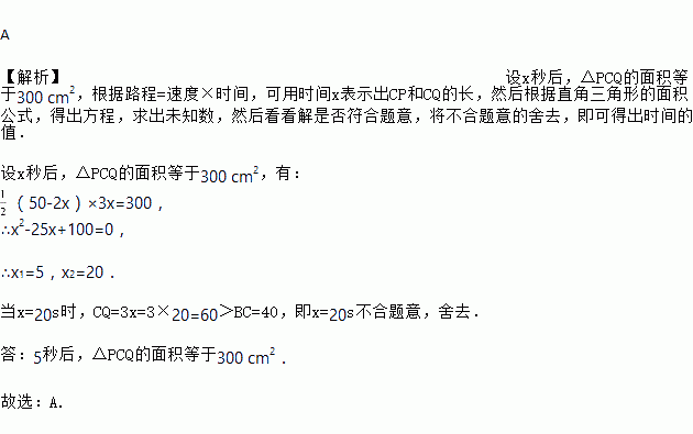 如图,在△ABC中,AC=50 cm,BC=40 cm,∠C=90°,点P从点A开始沿AC边向点C以2 cm/s的速度匀速运动,同时另一点Q由点C开始以3 cm/s的速度沿着CB向点B匀速运动,当其中一点到达终点时,另一点也随之停止运动,则当△PCQ的面积等于300 cm2时,运动时间为( )