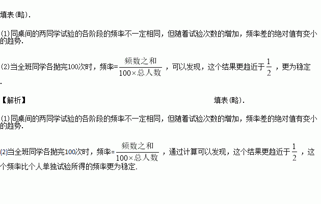 (2)计算全班同学做此试验出现正面的频率,并将这个频率与每个人单独试验的频率进行比较,你认为哪个频率更趋于稳定?