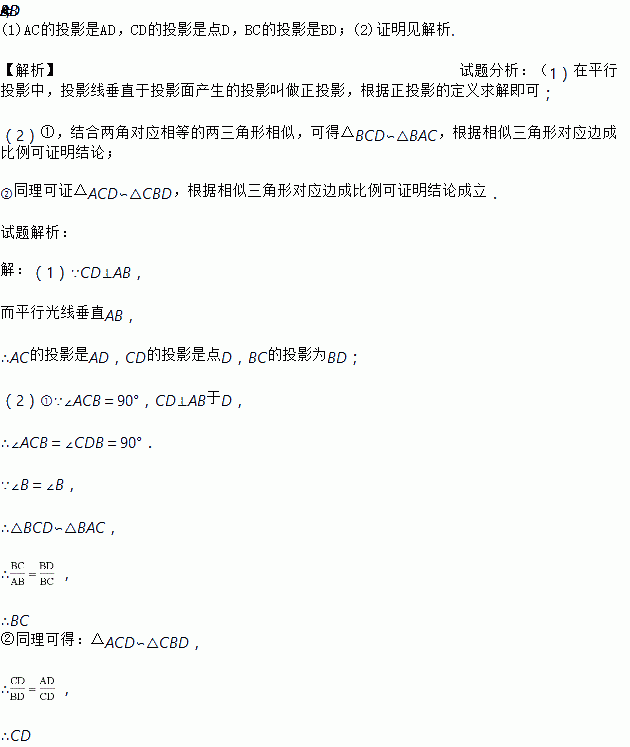 如图所示,△ABC被平行光线照射,CD⊥AB于D,AB在投影面上.