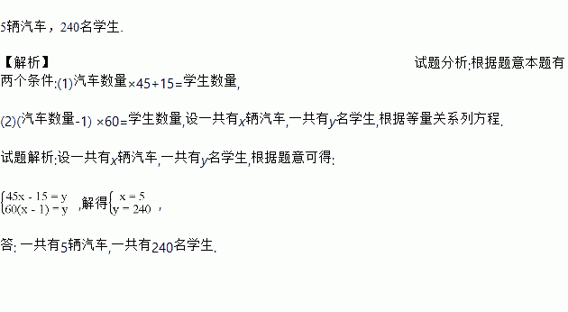 初一级学生去某处旅游,如果每辆汽车坐45人,那么有15个学生没有座位;如果每辆汽车坐60人,那么空出1辆汽车。问一共多少名学生、多少辆汽车。