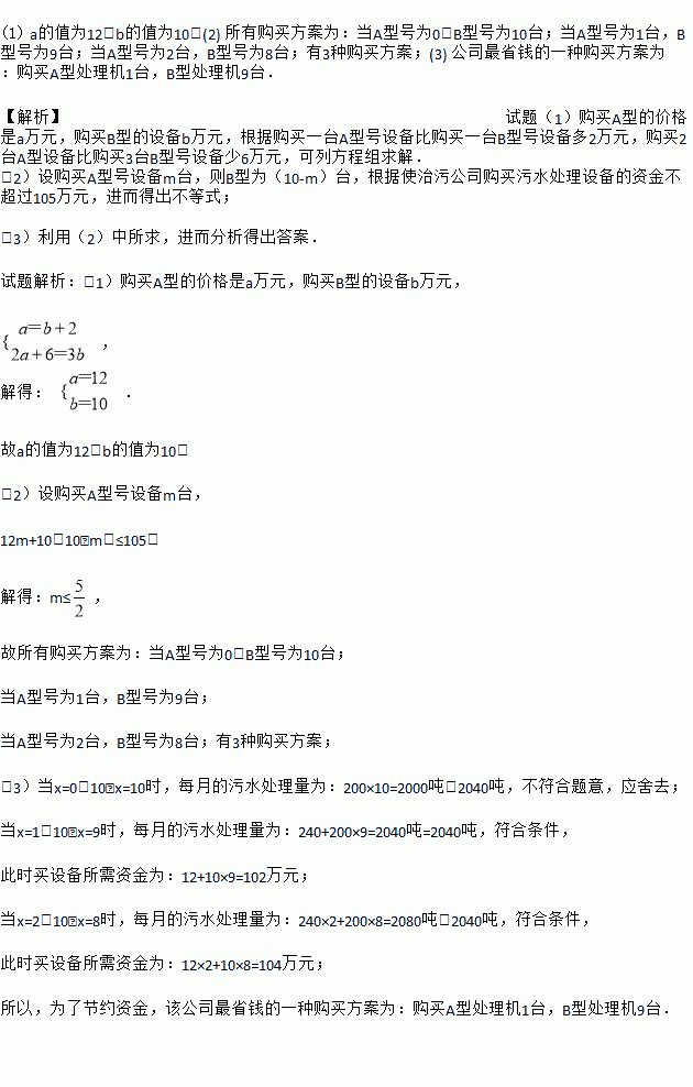 为了更好改善河流的水质,治污公司决定购买10台污水处理设备.现有A,B两种型号的设备,其中每台的价格,月处理污水量如下表:经调查:购买一台A型设备比购买一台B型设备多2万元,购买2台A型设备比购买3台B型设备少6万元.