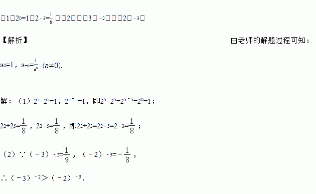 小明学了有理数的乘方后,知道23=8,25=32,他问老师,有没有20,2﹣3,如果有,等于多少?老师耐心提示他:25÷23=4,25﹣3=4,即25÷23=25﹣3=22=4,…“哦,我明白了了,”小明说,并且很快算出了答案,亲爱的同学,你想出来了吗?