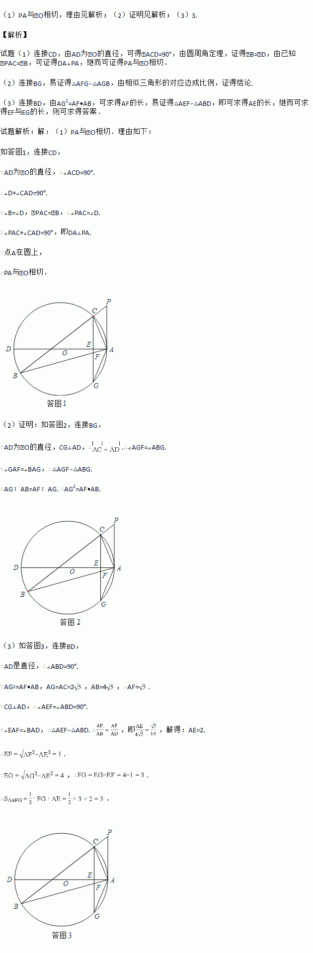 如图,△ABC的内接三角形,P为BC延长线上一点,∠PAC=∠B,AD为⊙O的直径,过C作CG⊥AD于E,交AB于F,交⊙O于G。