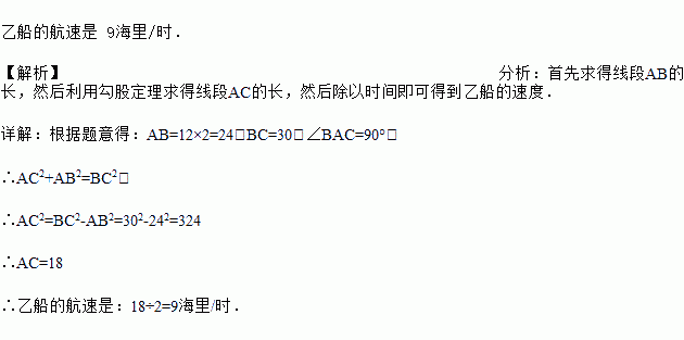 如图,甲乙两船同时从A港出发,甲船沿北偏东35°的方向,以每小时12海里的速度向B岛驶去.乙船沿南偏东55°的方向向C岛驶去,2小时后,两船同时到达了目的地.若C、B两岛的距离为30海里,问乙船的航速是多少?