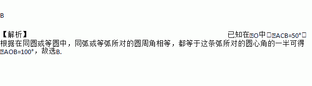 B 【解析】已知在⊙O中,∠ACB=50°,根据在同圆或等圆中,同弧或等弧所对的圆周角相等,都等于这条弧所对的圆心角的一半可得∠AOB=100°,故选B.